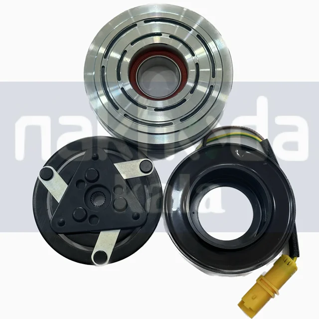 کلاچ کولر یا کلاچ کمپرسور:کمپرسور به وسیله تسمه نیروی چرخشی خود را از موتور خودرو میگیرد و تسمه هم از طریق پولی نیروی چرخشی منتقل شده توسط تسمه را به کمپرسور منتقل میکند، پس پولی همیشه در حال چرخش است.اما سؤال این جاست که پس چطور ما میتوانیم کولر خودرو و در نتیجه کمپرسور را خاموش و روشن کنیم اگر همیشه پولی در حالی چرخش است؟جواب اینجاست: کلاچ کمپرسوراما کار این قطعه چیست؟کلاچ کولر وظیفه درگیر کردن کمپرسور با پولی سر کمپرسور را دارد یعنی کلاچ بین پولی و کپرسور قرار دارد و هر وقت که اقدام به روشن کردن کولر شود، کلاچ کمپرسور را به پولی متصل کرده و باعث چرخش آن میشود.کلاچ چگونه این کار را انجام میدهد؟داخل کلاچ کولر یک بوبین یا آهنربا ی الکتریکی قرار دارد (یعنی یک سیم پیچ که با اتصال برق تبدیل به آهنربا میشود)، وقتی شما کولر خودرو را روشن مینمایید این آهنربا فعال شده و باعث بسته شدن و در نهایت درگیر شدن و ارتباط کمپرسور با پولی میگردد.