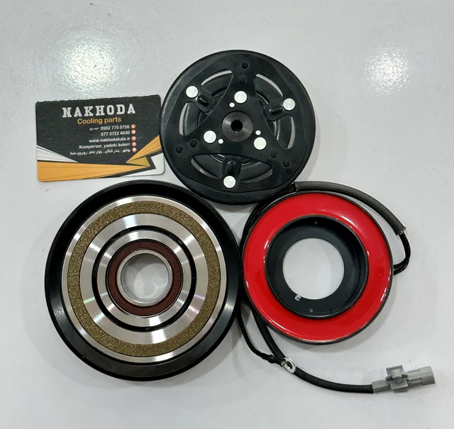 کلاچ کولر یا کلاچ کمپرسور:کمپرسور به وسیله تسمه نیروی چرخشی خود را از موتور خودرو میگیرد و تسمه هم از طریق پولی نیروی چرخشی منتقل شده توسط تسمه را به کمپرسور منتقل میکند، پس پولی همیشه در حال چرخش است.اما سؤال این جاست که پس چطور ما میتوانیم کولر خودرو و در نتیجه کمپرسور را خاموش و روشن کنیم اگر همیشه پولی در حالی چرخش است؟جواب اینجاست: کلاچ کمپرسوراما کار این قطعه چیست؟کلاچ کولر وظیفه درگیر کردن کمپرسور با پولی سر کمپرسور را دارد یعنی کلاچ بین پولی و کپرسور قرار دارد و هر وقت که اقدام به روشن کردن کولر شود، کلاچ کمپرسور را به پولی متصل کرده و باعث چرخش آن میشود.کلاچ چگونه این کار را انجام میدهد؟داخل کلاچ کولر یک بوبین یا آهنربا ی الکتریکی قرار دارد (یعنی یک سیم پیچ که با اتصال برق تبدیل به آهنربا میشود)، وقتی شما کولر خودرو را روشن مینمایید این آهنربا فعال شده و باعث بسته شدن و در نهایت درگیر شدن و ارتباط کمپرسور با پولی میگردد.
